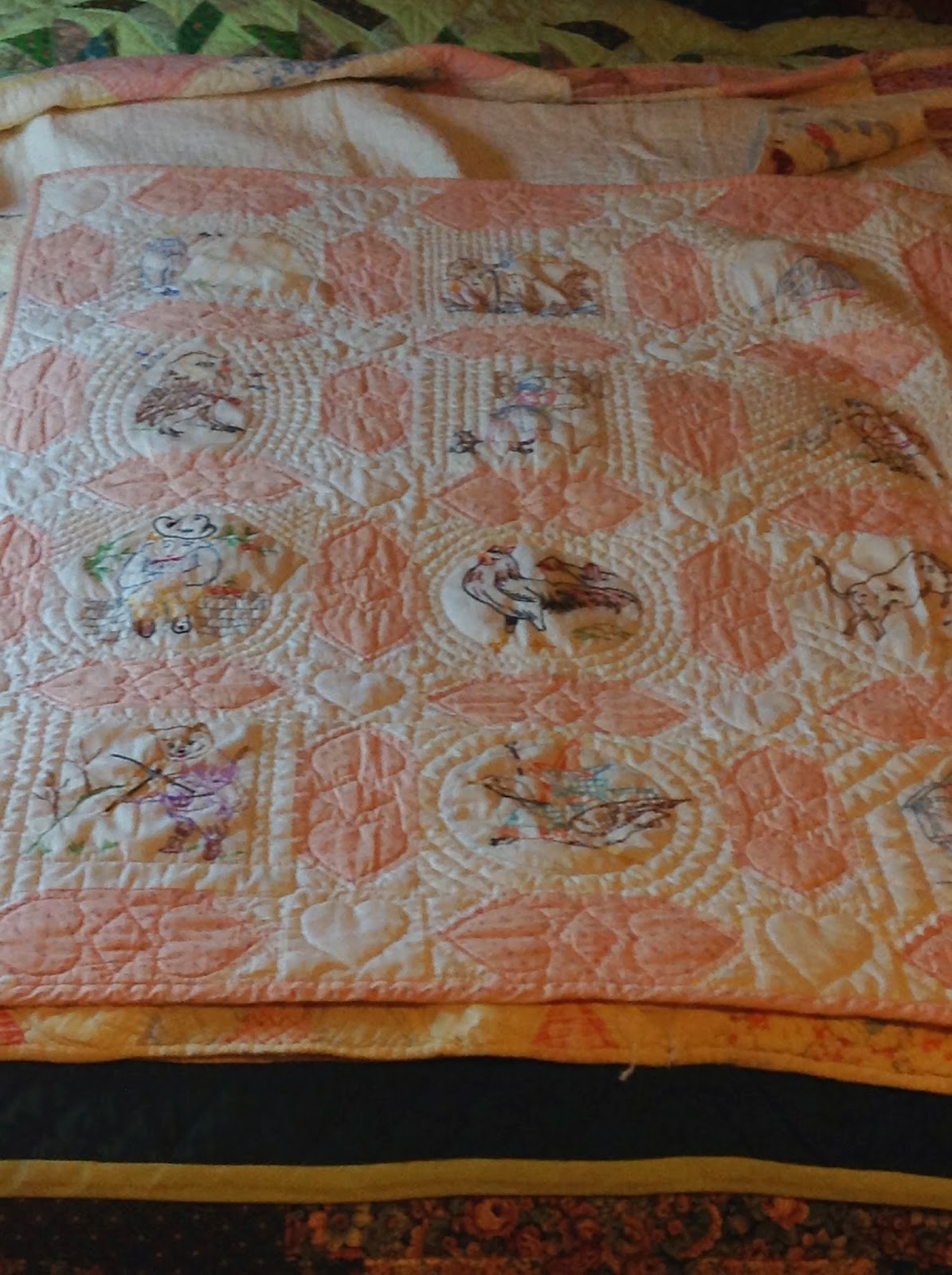 This was one of my daughter's baby quilts. My Mom embroidered it, I pieced it and quilted it by hand. This was 1983.
